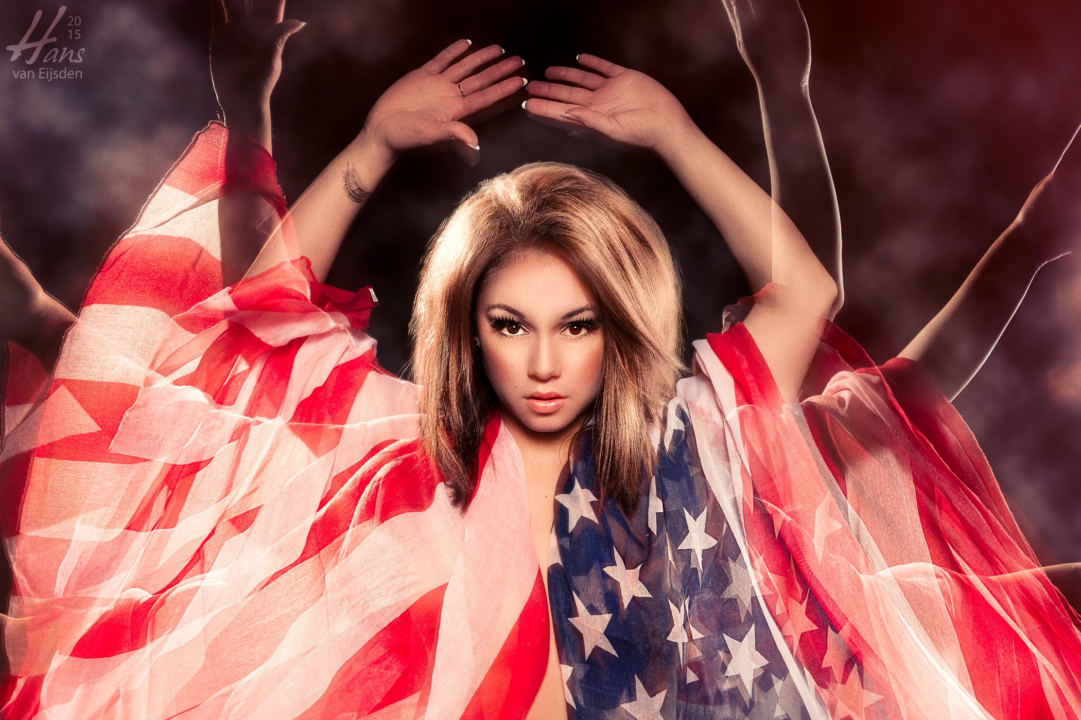 With the camera on a tripod I opened the shutter for 1.3 seconds. Within those seconds I made multiple flashes with the background lights to create multiple silhouettes of her arms and at the end of the exposure, at 1.2 seconds, I fired the main key light to freeze her and to light her face.