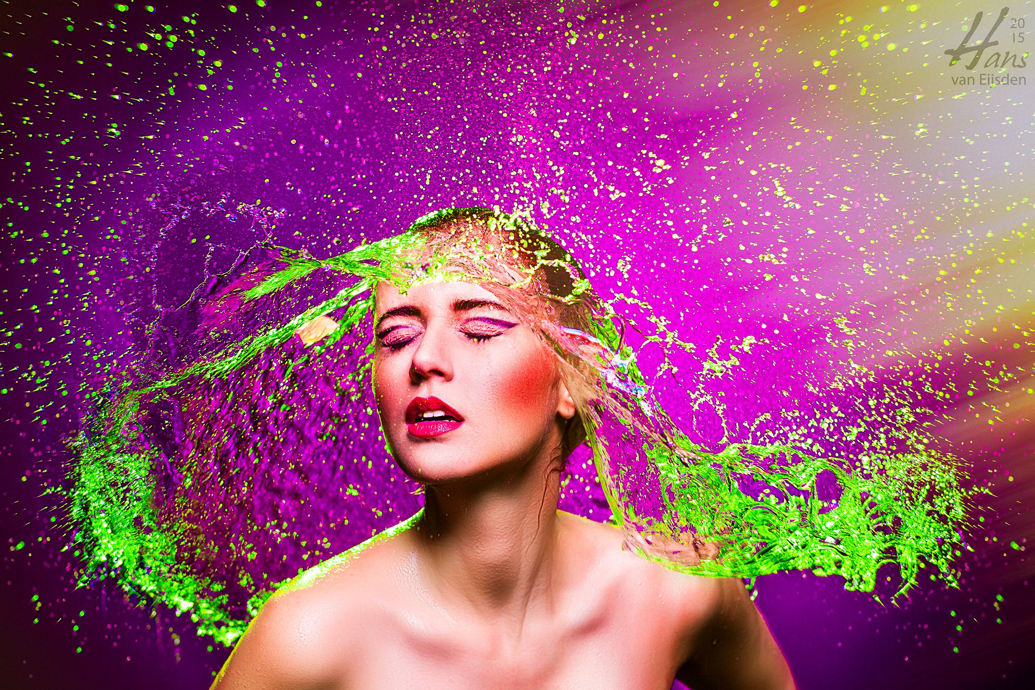The flash durations of the back lights were 1/5250s and the flash duration of the key light (a beauty dish with grid) was 1/5000s. I used thumbtacks (drawing pins) taped on her head to let the water balloons pop. Thanks Ayse Aslan for the hair & makeup, for throwing those ice cold things and for giving us enough reason to laugh and keep laughing. 😉